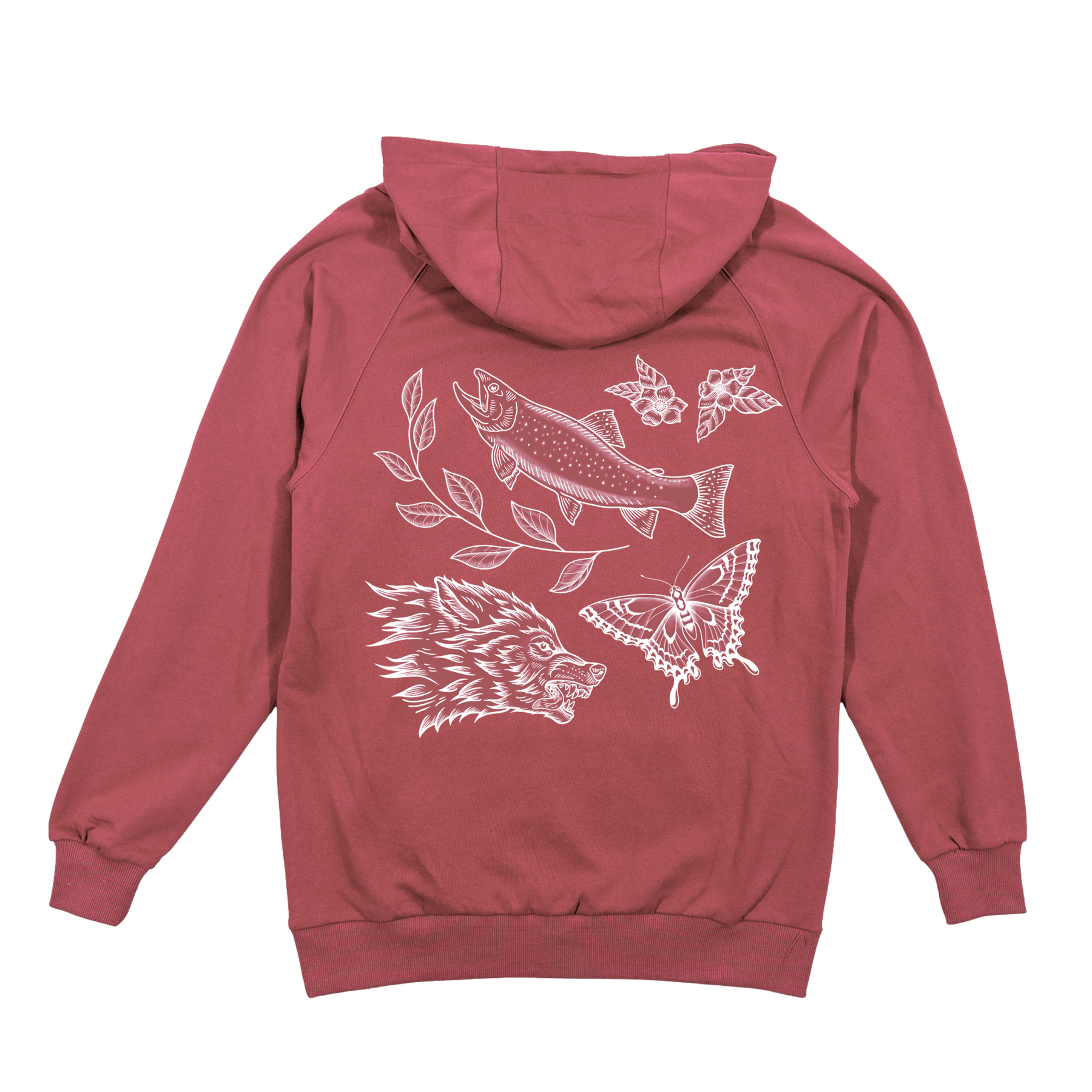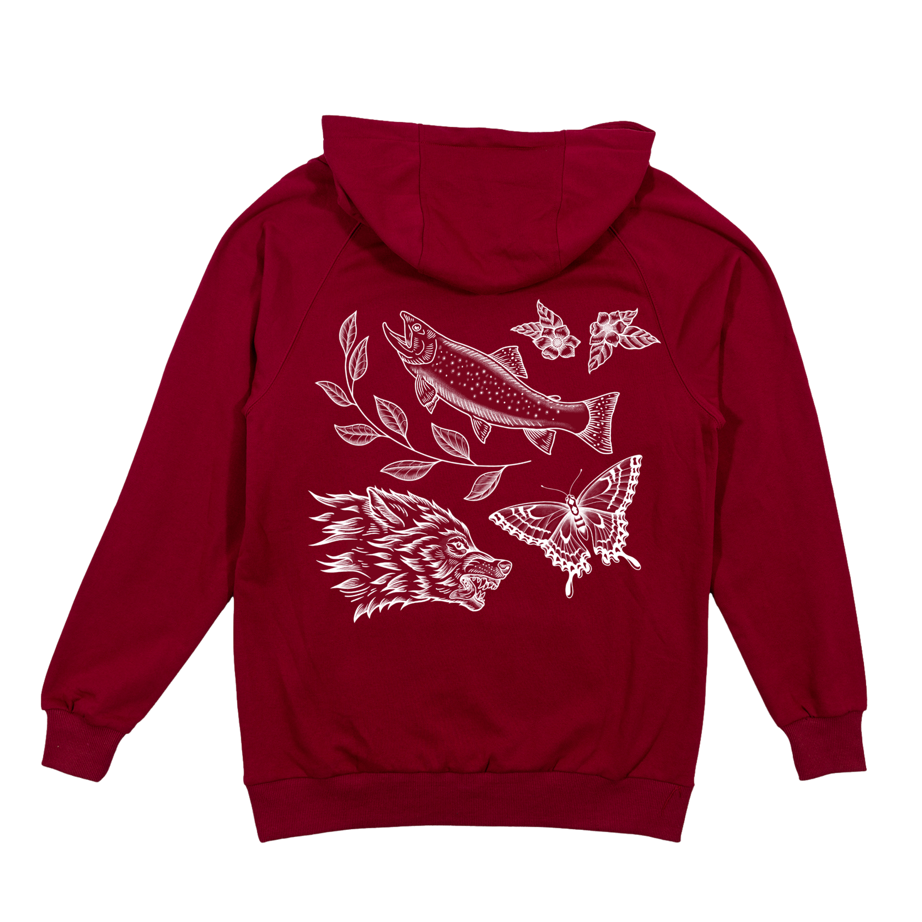 The Flash Sheet Hemp Hoodie features a striking collection of hand-drawn illustrations by artist and tattooer Sarah King. Inspired by tattoo flash sheets, her artwork adds bold, inked energy to this everyday staple. Printed on 100% hemp terry (300gsm) for natural breathability, durability, and everyday ease. Lightweight and eco-conscious, it’s perfect for cool spring and summer mornings.